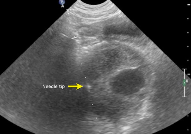 The tumor was biopsied. There was constant blood loss through the guiding needle. At the end of the procedure two gelatin foam plugs were placed (echogenic stripes (arrows).