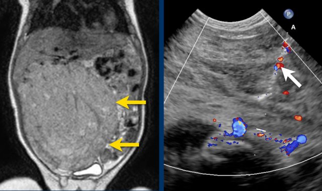A four-month-old boy presented with an abdominal mass. Ultrasound showed a mass from the caudal part of the right liver lobe, extending into the pelvis.
