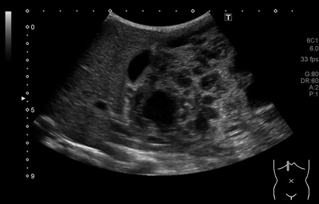An ultrasound examination had shown multiple lesions in both kidneys.