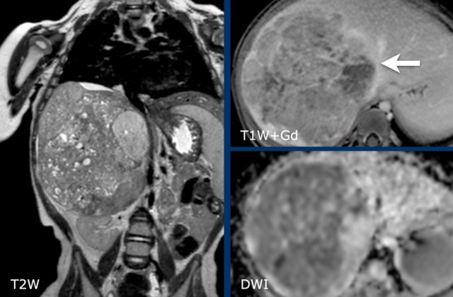 MRI shows a large tumor at the caudal site of the liver, extending to the bladder.