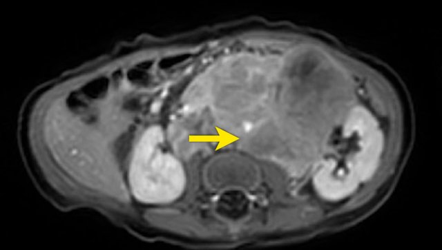 Notice the tumor extension posterior to the aorta, which is displaced away from the vertebral column (arrow).