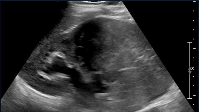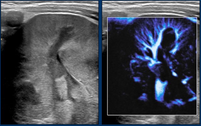 This is the initial ultrasound of the same patient showing the tumor and tumor thrombus.