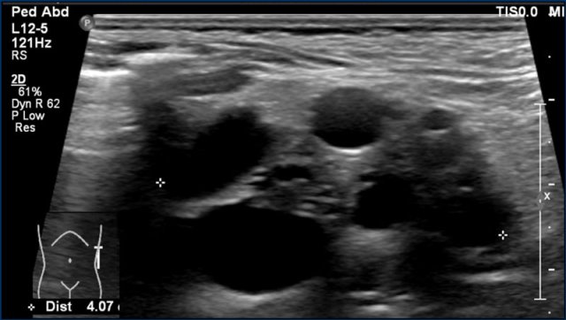 ultrasound examination shows enlarged kidneys with multiple hypo-echoic