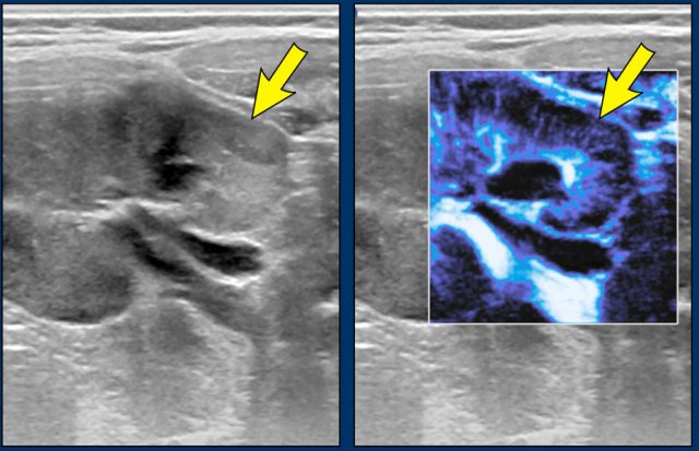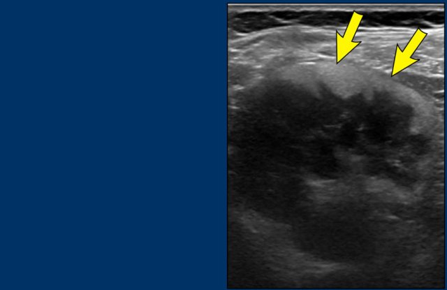 to look for are multiple focal lesions that are homogeneous and hypoechoic on ultrasound and show strong diffusion restriction on MRI. 5,6