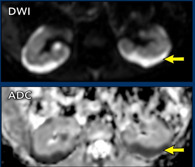 The tumor was thought to be a Wilms tumor, because of the limited diffusion restriction, but pathology showed a clear cell sarcoma of the kidney.