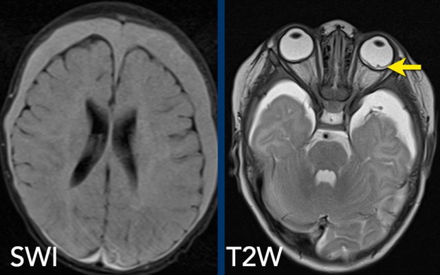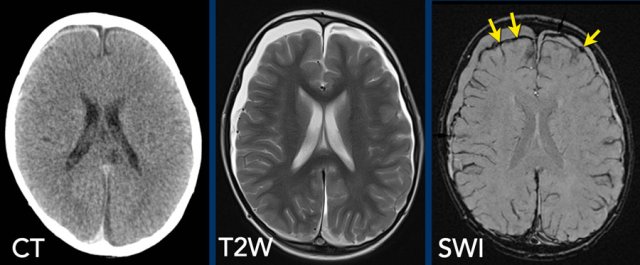 The SWI shows bilateral subdural hematomas in a 3-month-old abused girl.