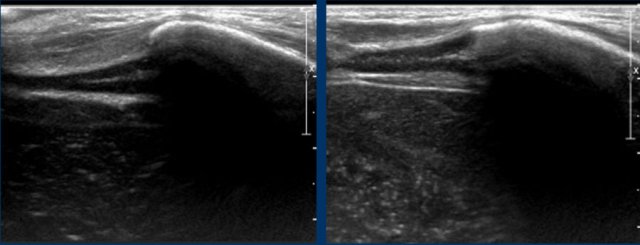 Bilateral hypoechoic subdural fluid collections that outline the arachnoid membrane very well (arrows). The cloudy aspect of the fluid suggests it is hemorrhagic. The subdural hematomas barely show any vessels in contrast with the abundant subarachnoid vessels.