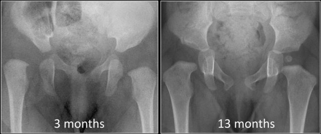 In this case at 13 months the only sign of the former dysplasia is the delay of the femoral head to ossify.