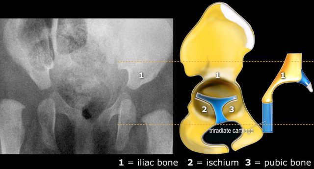 - Lower limb of the iliac bone (=Undersurface of the medial border of the acetabulum where the iliac bone meets the triradiate cartilage)