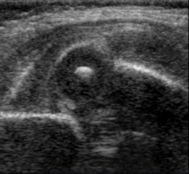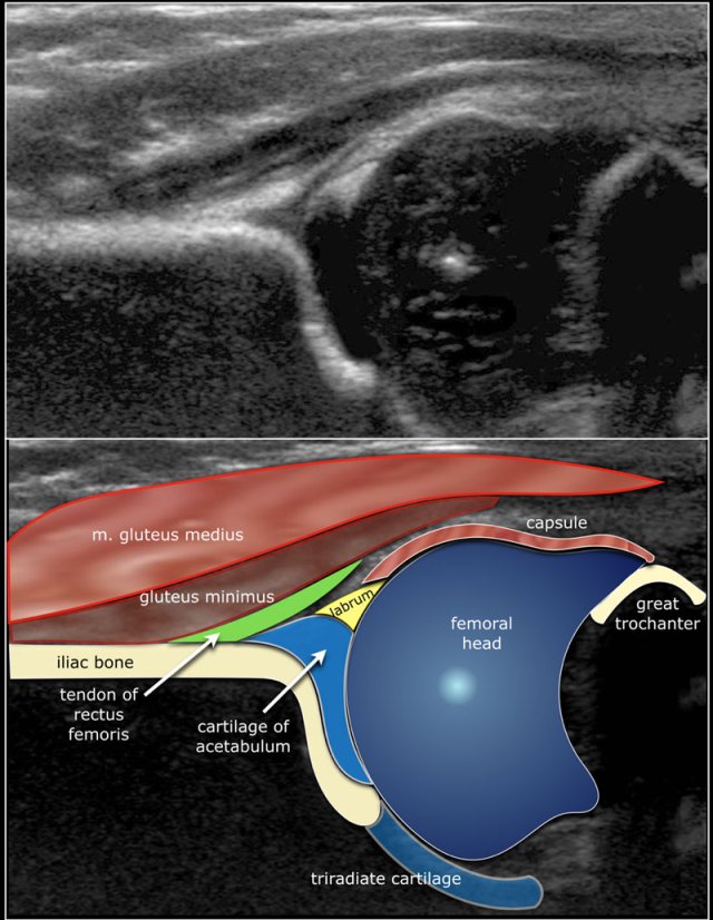 Since ultrasound has the advantage of also displaying the cartilagenous structures, we can also look at the coverage of the femoral head by the cartilage of the acetabulum and the labrum.