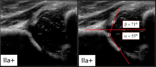 So an alpha angle of 56 degrees at the age of 7 weeks is called type IIa+, while at the age of 10 weeks it is called a type IIa-.