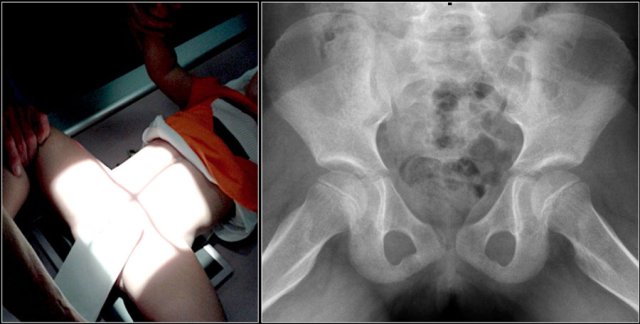 In case of suspected pathology on the frog-leg lateral view, an additional AP radiograph should also be acquired for orthopedic and follow-up purposes.