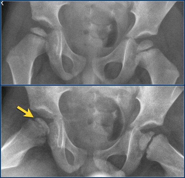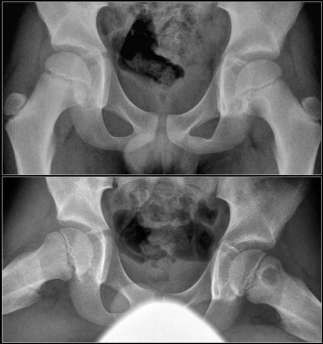 Contrary to Perthes disease, the abnormalities are usually symmetric.