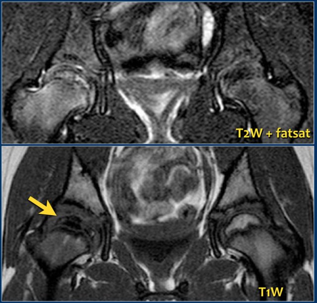 Sometimes a radiographically occult fracture can be detected on MRI as a double rim sign on T2-weighted images with fatsat.