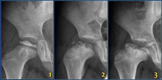 In most cases, less than 4 joints are involved. Large joints are mainly affected, including the hips.