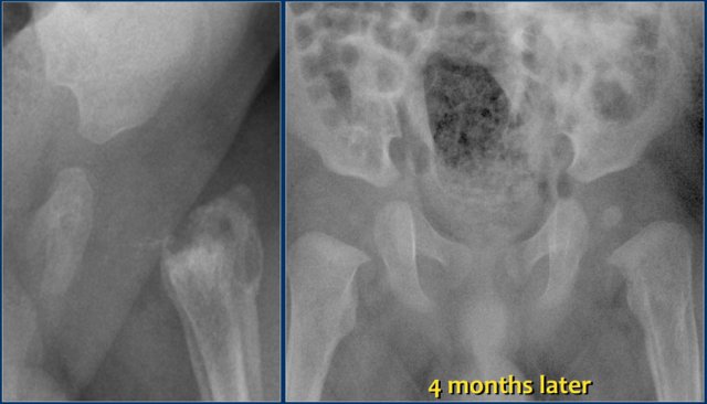 At four months follow-up a residual, but less prominent periosteal reaction is present and there is accelerated bone maturation.