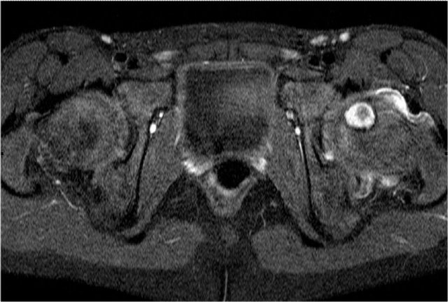 5 week old, sick infant with severe osteomyelitis of the left hip. MRI with Gadolinium contrast shows extensive soft tissue involvement and periosteal reaction.